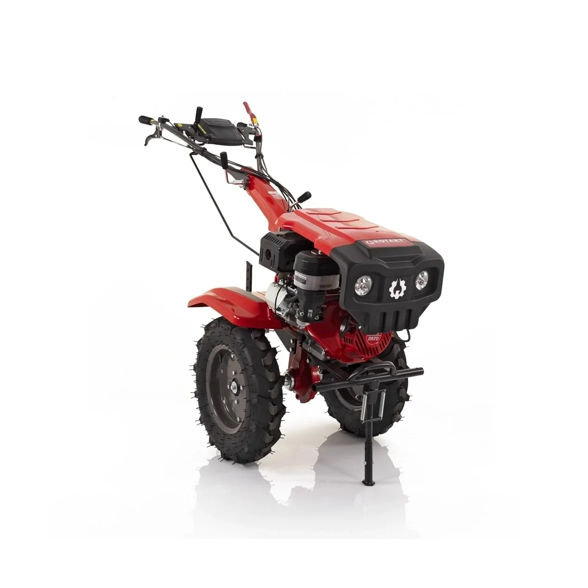 Motocultor Rotakt Atlas RO10R-2P, echipat cu 2 prize de putere si un motor puternic de 10 CP alimentat cu benzină, se afirmă ca un partener de încredere în cadrul activităților agricole. Datorită cutiei de viteze cu 2 prize de putere și carcasei din fontă, acest motocultor oferă durabilitate și eficiență într-o varietate de aplicații agricole. Fiabilitatea motocultorului Rotakt Atlas RO10R-2P este susținută de motorul de generație nouă și un filtru de aer îmbunătățit. Carcasa reductorului din fontă conferă motocultorului o greutate sporită și o rezistență crescută. Cu o lățime de lucru cuprinsă între 560 și 1050 mm și adâncimea de lucru reglabilă între 150 și 300 mm, motocultorul este potrivit pentru diverse activități, de la grădinărit la lucrări în vie sau câmp. Motocultorul Rotakt Atlas RO10R-2P dispune de cutie de viteze, 2 prize de putere și carcasă din fontă, sistem de oprire de siguranță, ghidon reglabil pe două axe (sus/jos – stânga/dreapta), freze segmentabile cu 4 tronsoane de cuțite și discuri laterale, bară de reglare a adâncimii, roți mari de 5.00-12, suport pentru freze, cutie de scule, capotă cu faruri și tuburi hexagonale cu satelit. Cu o greutate de 110 kg (fără freze), motocultorul oferă stabilitate și manevrabilitate. Sistemul de transmisie pe pinioane, ambreiajul cu discuri în ulei și prezența senzorului de ulei pentru protecția motorului asigură o funcționare eficientă și durabilă, cu un cuplu maxim al motorului de 21 Nm. Motorul, cu specificații tehnice precum racirea fortată cu aer, un singur cilindru și capacitatea cilindrică de 301cmc, furnizează performanțe de top în categoria sa. Consumul redus de combustibil (≤350 g / kW / oră) și rezervorul cu o capacitate de 5.4 litri fac motocultorul eficient și autonom. Motocultorul Rotakt Atlas RO10R-2P, cu caracteristicile sale avansate și capacitatea de a atașa accesorii suplimentare, reprezintă un instrument versatil potrivit pentru diverse activități agricole, asigurând o experiență fiabilă și eficientă în utilizare. Rotakt Atlas RO10R-2P se evidențiază prin caracteristici tehnice avansate și un design bine conceput, inclusiv capota decorativă prevăzută cu faruri. Această capotă nu servește doar unui scop estetic, ci și funcțional, datorită farurilor asigura iluminare adecvată în condiții de lucru slab iluminate. Motorul are un sistem integrat pentru producerea curentului electric, asigurând iluminare adecvată în condiții de lucru slab iluminate. Motocultorul Rotakt Atlas RO10R-2P se distinge prin versatilitatea sa, fiind compatibil cu diverse accesorii care extind gama sa de funcționalități. Este perfect adaptat pentru atașarea unor accesorii esențiale precum plugul de arat, plugul de bilonat și plugul de scos cartofi, oferind astfel posibilitatea de a executa diverse operațiuni agricole cu eficiență și precizie. De asemenea, motocultorul Rotakt Atlas RO10R-2P poate fi utilizat în combinație cu remorca Rotakt REM 500 sau Rotakt REM 600, oferind fermierilor posibilitatea de a transporta cu ușurință atât accesorii cât și recolta obținută în urma muncii agricole. Această compatibilitate adaugă un nivel suplimentar de versatilitate și eficiență în gestionarea activităților agricole. Astfel, motocultorul Rotakt Atlas RO10R-2P nu numai că oferă performanțe remarcabile în operațiunile de prelucrare a solului, dar se dovedește a fi un partener de încredere și adaptabil în întreaga gamă de activități agricole, sporind astfel productivitatea și eficiența în exploatația agricolă.